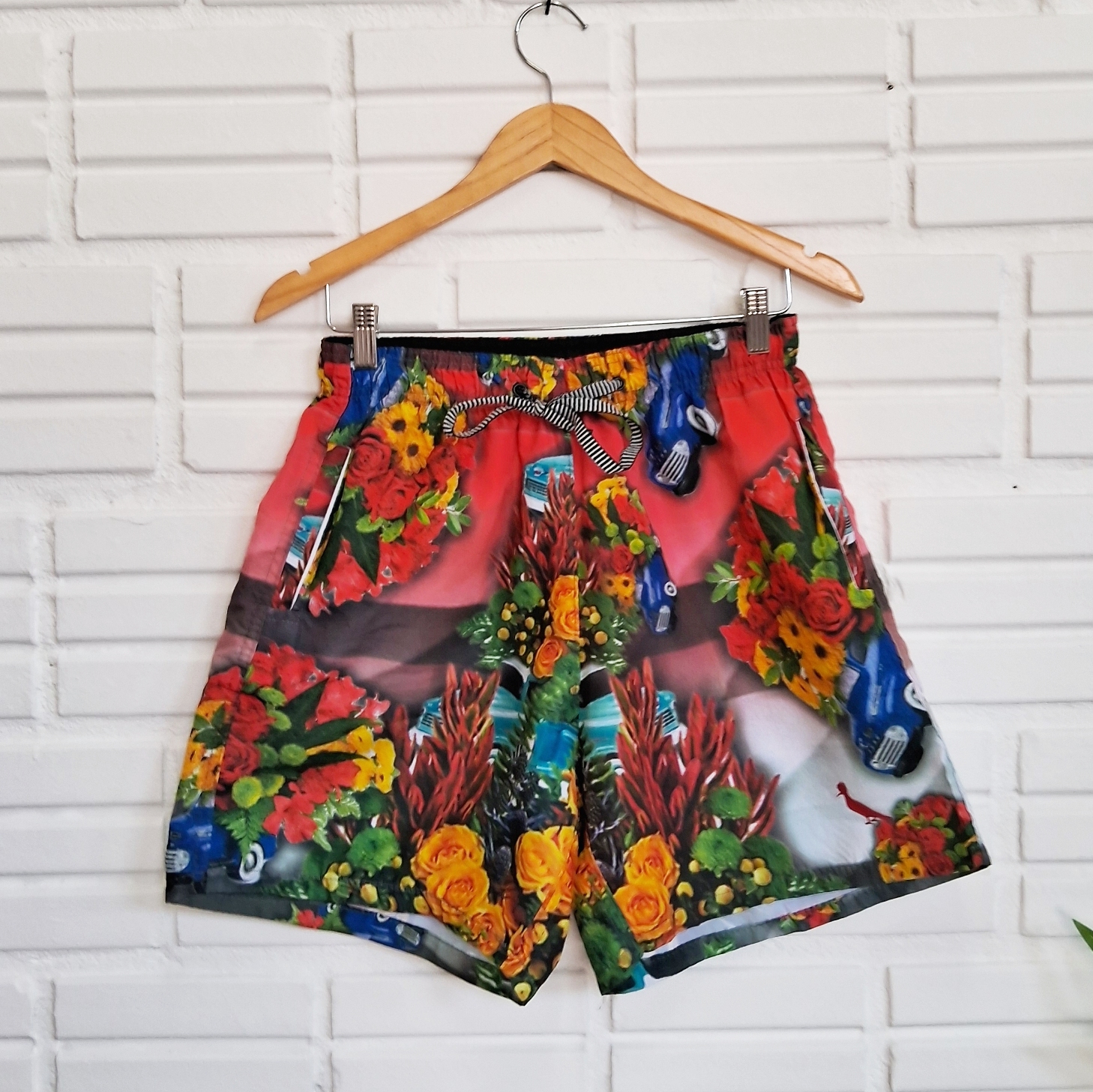 bermuda colorida com estampa colorida floral e de carros vintage. 100% poliéster. possui elástico na cintura com cordão para ajustar e bolsos funcionais.