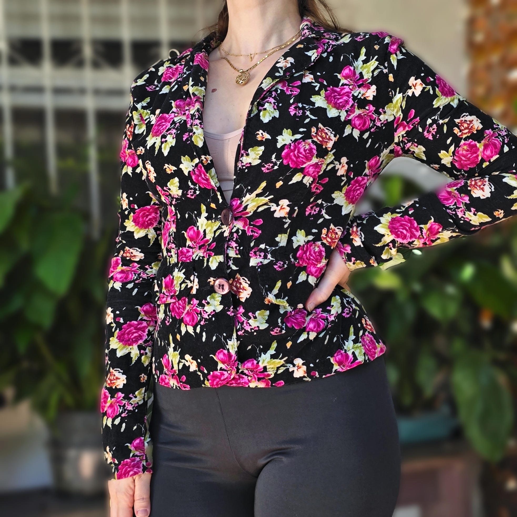 Blazer preto floral em veludo cotelê de algodão, sem elasticidade. Possui bolsos funcionais e abotoamento frontal.