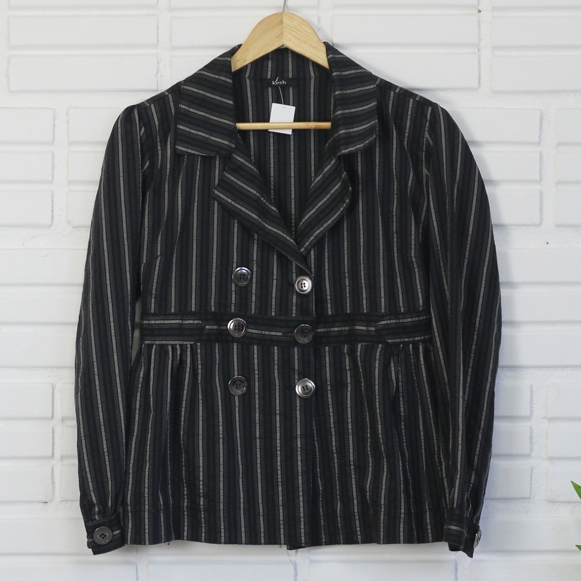 blazer preto e cinza listrado. peça leve, não é estruturada. 76% poliéster e 24% algodão.