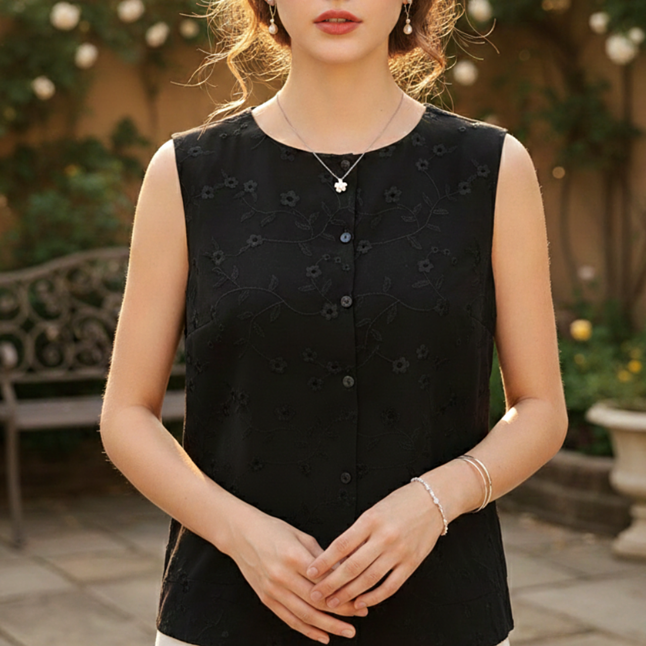 Blusa y2k, provavelmente vintage, preta de tecido plano e sintético com delicado bordado floral. Possui forro e abotoamento frontal.