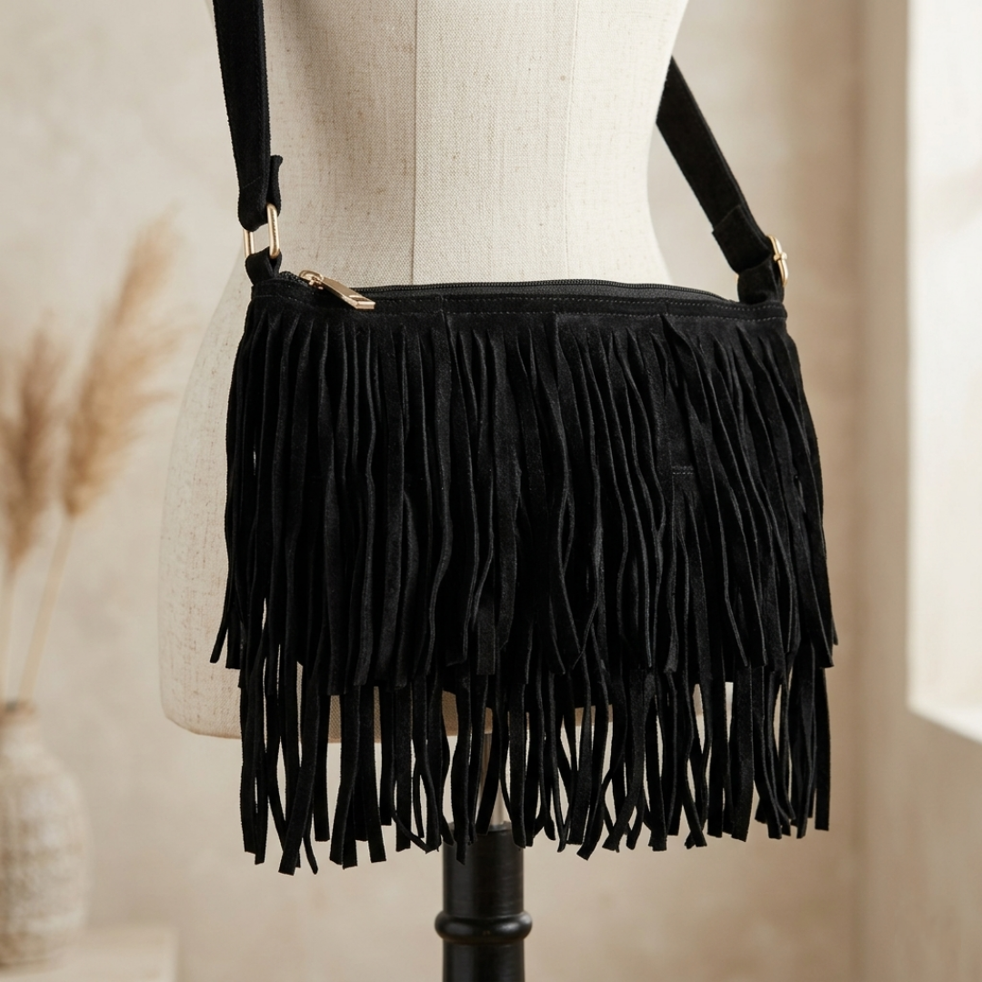 Bolsa Tiracolo Vicentina Brasil em camurça (couro legítimo) preta natural. Estilo Boho/Western com franjas longas e ferragens douradas. Interior com forro animal print (leopardo) e fechamento em zíper superior.