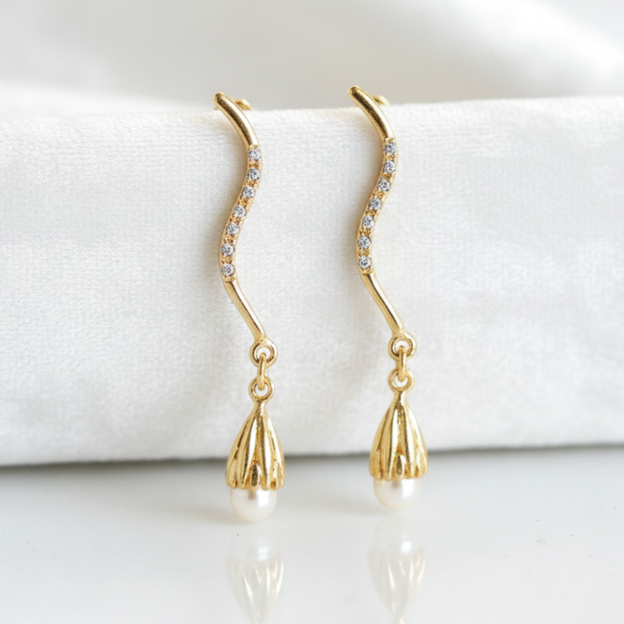 Brinco dourado longo com pedras brancas. Folheado / dourado. 7,5cm. Não acompanha as tarraxas.