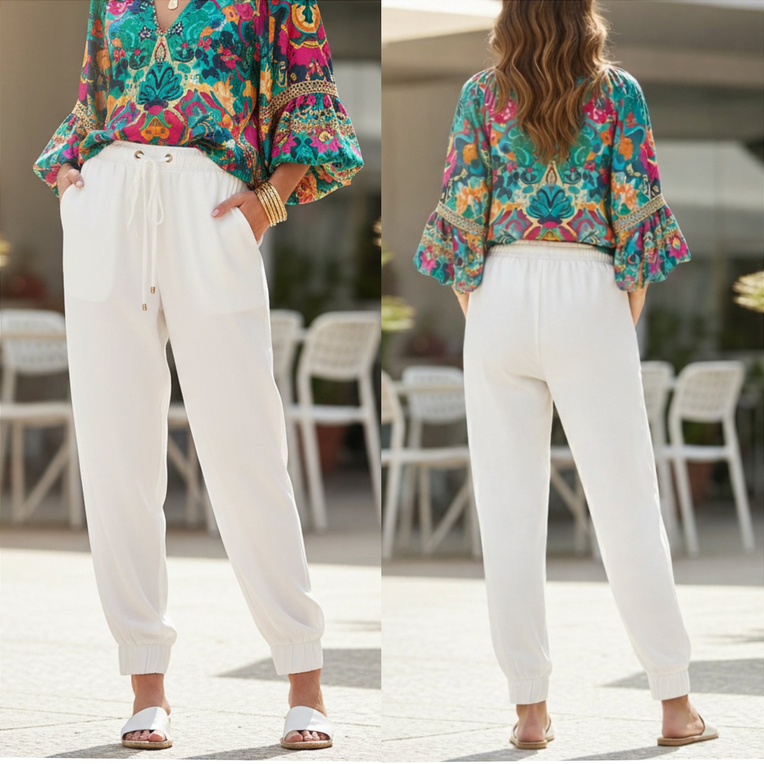 Calça jogger off white de tecido plano e sintético (crepe duna, poliéster). Modelo com elástico na cintura alta e tornozelos, forro curto estilo shortinho, cordão para ajustar cintura e detalhes com nome da marca.
