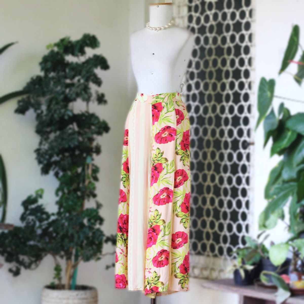 calça pantalona cor pêssego com linda estampa floral, de tecido leve e plano (parece ser algodão), modelo com cintura alta, fenda frontal dupla, forro estilo shortinho e ziper invisível lateral.
