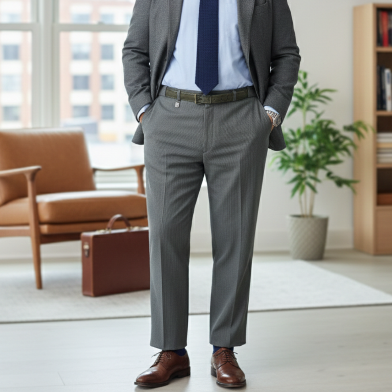 Calça social verde musgo de tecido grosso com leve elasticidade (poliéster) para outono/inverno. Possui 3 bolsos externos e 1 bolso seguro interno, passantes para cinto com cinto incluso e detalhes com nome da marca.