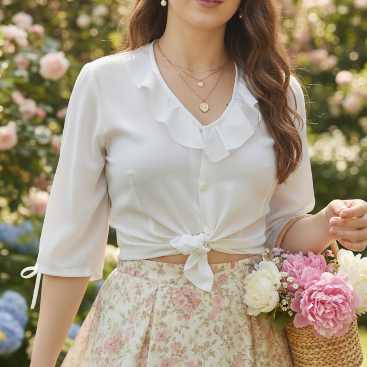 camisa vintage branca de tecido plano com leve transparência (poliéster). possui abotoamento frontal, mangas 3/4 com laço e babados na gola.