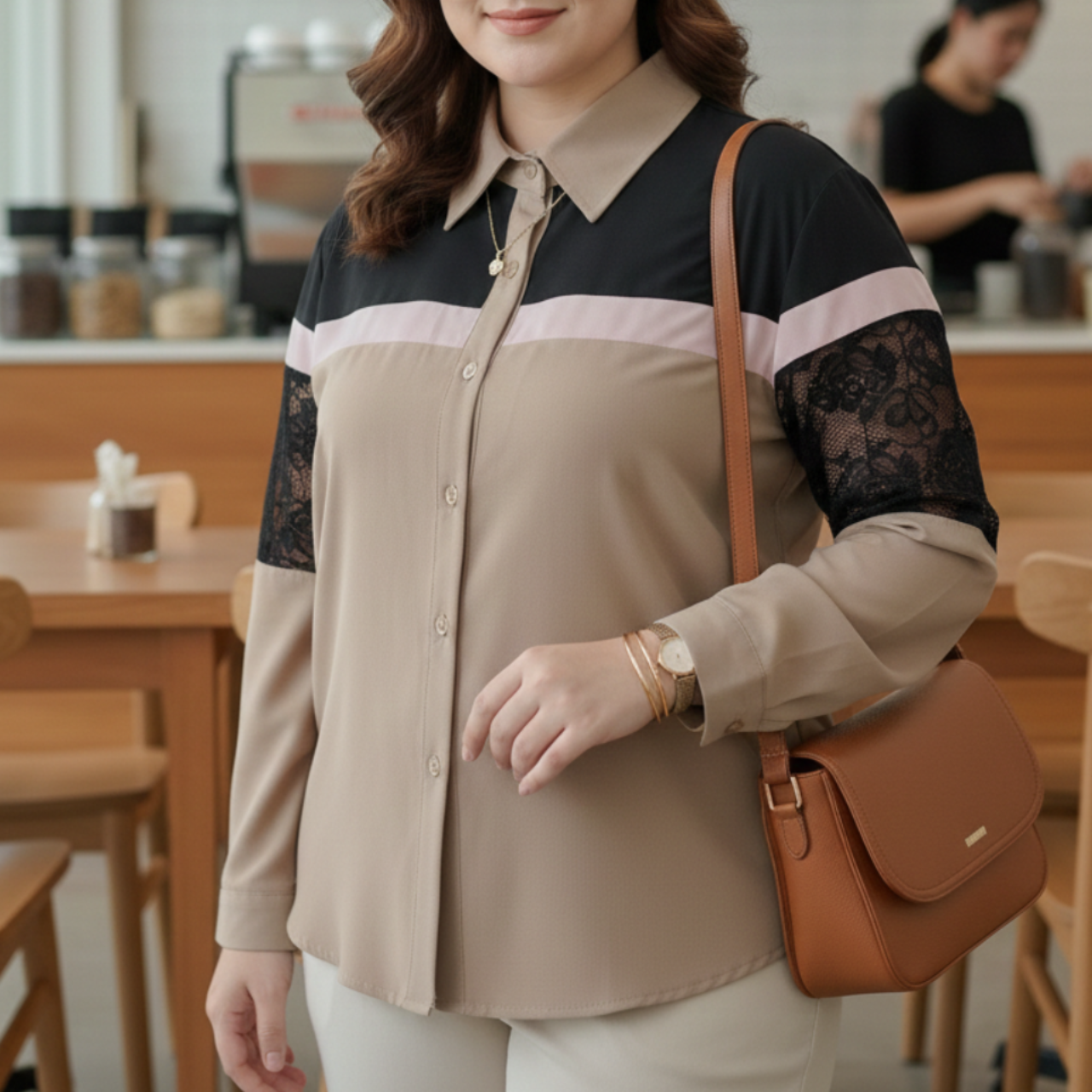 Camisa colorida manga longa com detalhes em renda. Tecido plano e sintético, poliéster. Abotoamento frontal e nos punhos.