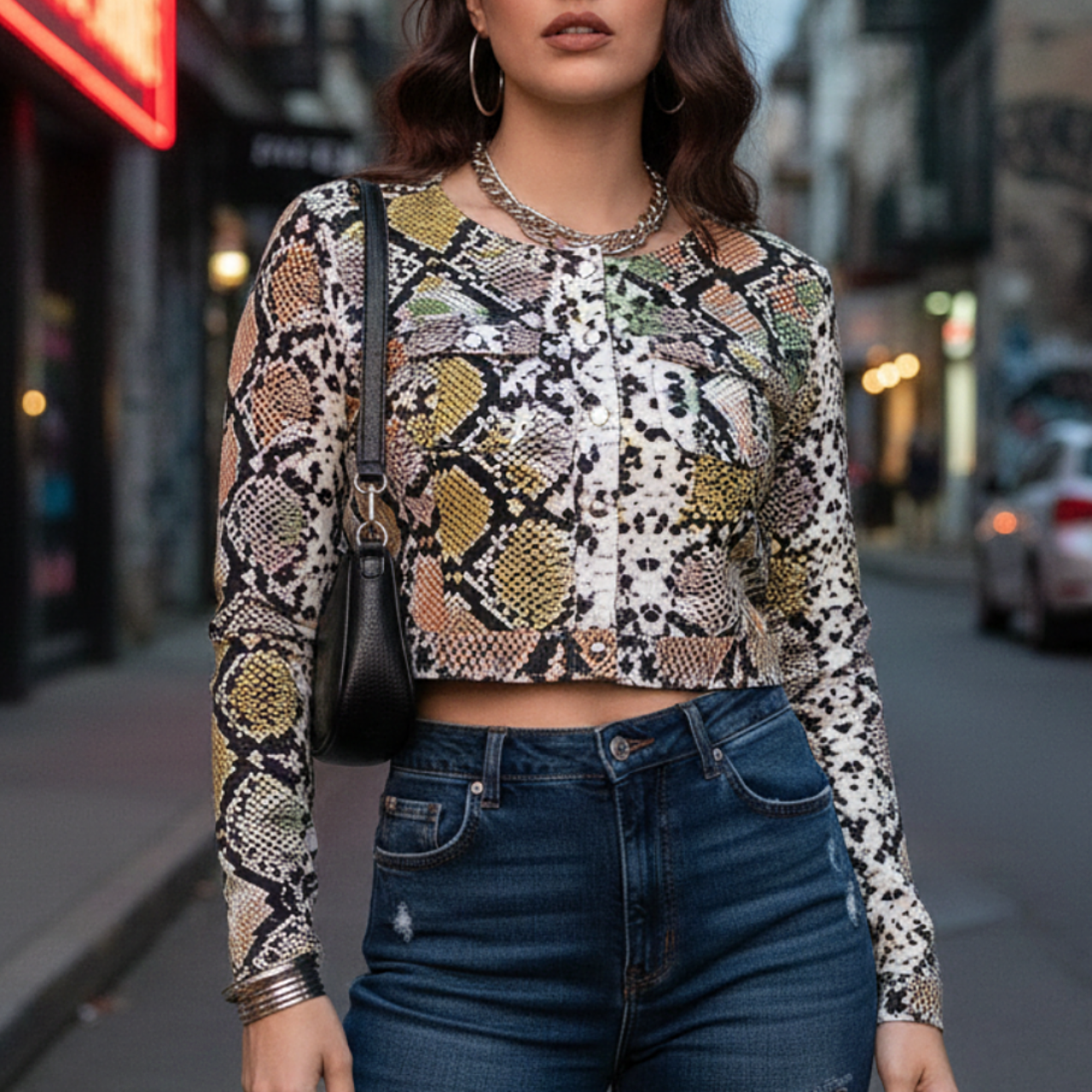 Casaqueto cropped estampado animal print, 97% algodão e 3% elastano. Possui bolsos funcionais e botões de pressão.