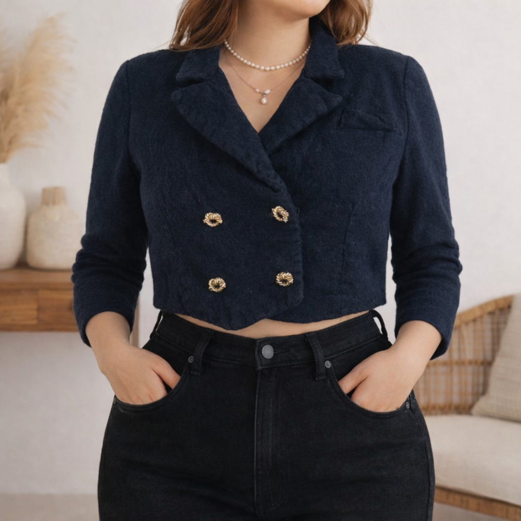 Casaqueto / casaco cropped azul vintage, com CGC, em lã batida de poliéster. Possui mangas 7/8, pequenas ombreiras e forro.