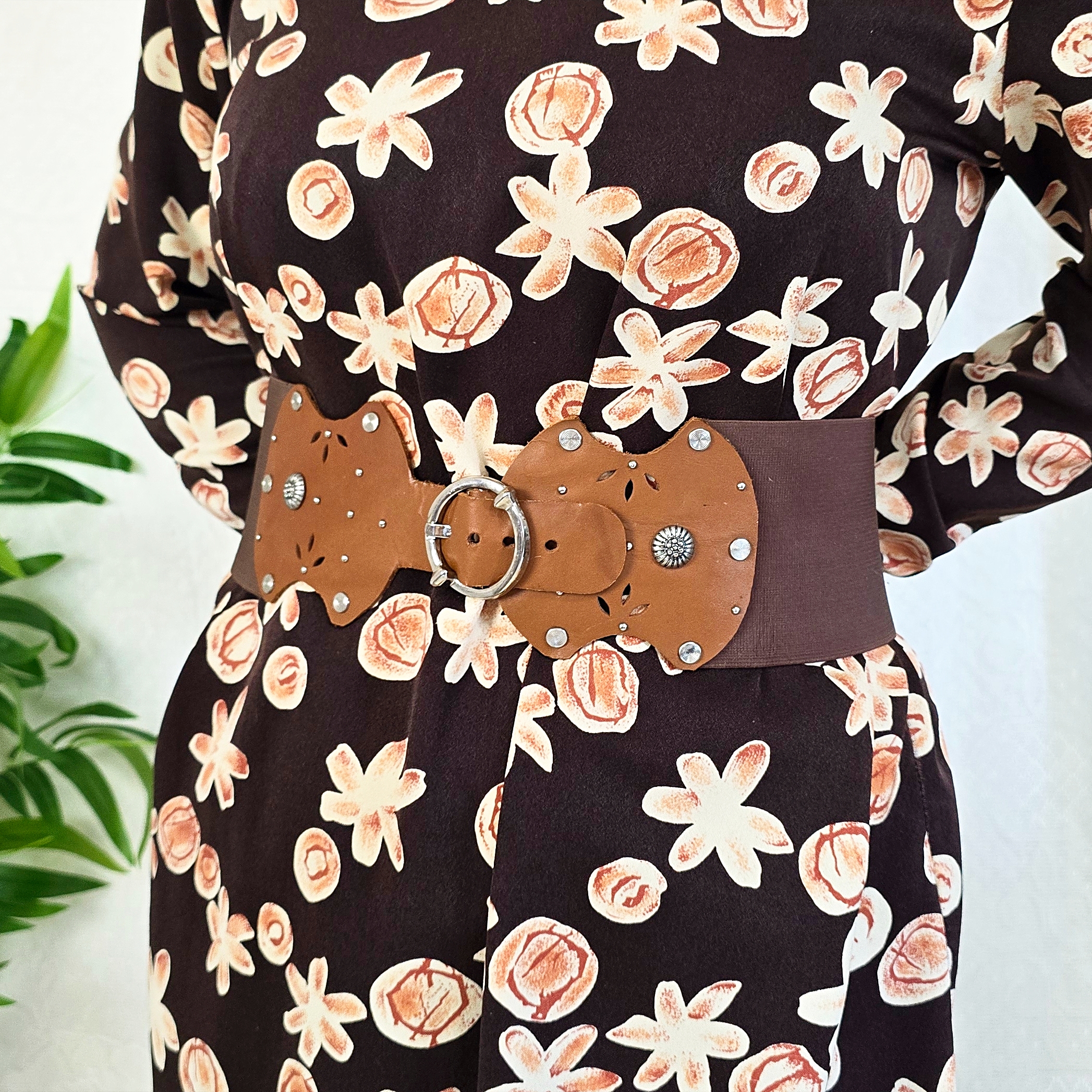 Cinto marrom para cintura, peça elástico com fivela prateada e detalhes em couro sintético. 94cm comprimento total, ideal parar cintura entre 85-95cm