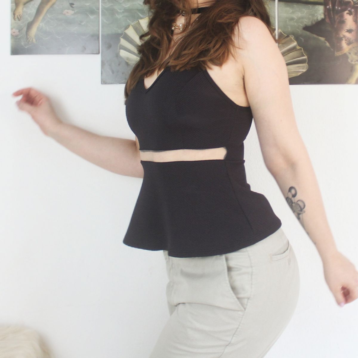 blusa preta de malha com leve elasticidade, sem mangas, com cintura marcada e detalhe vazado com tule na cintura.