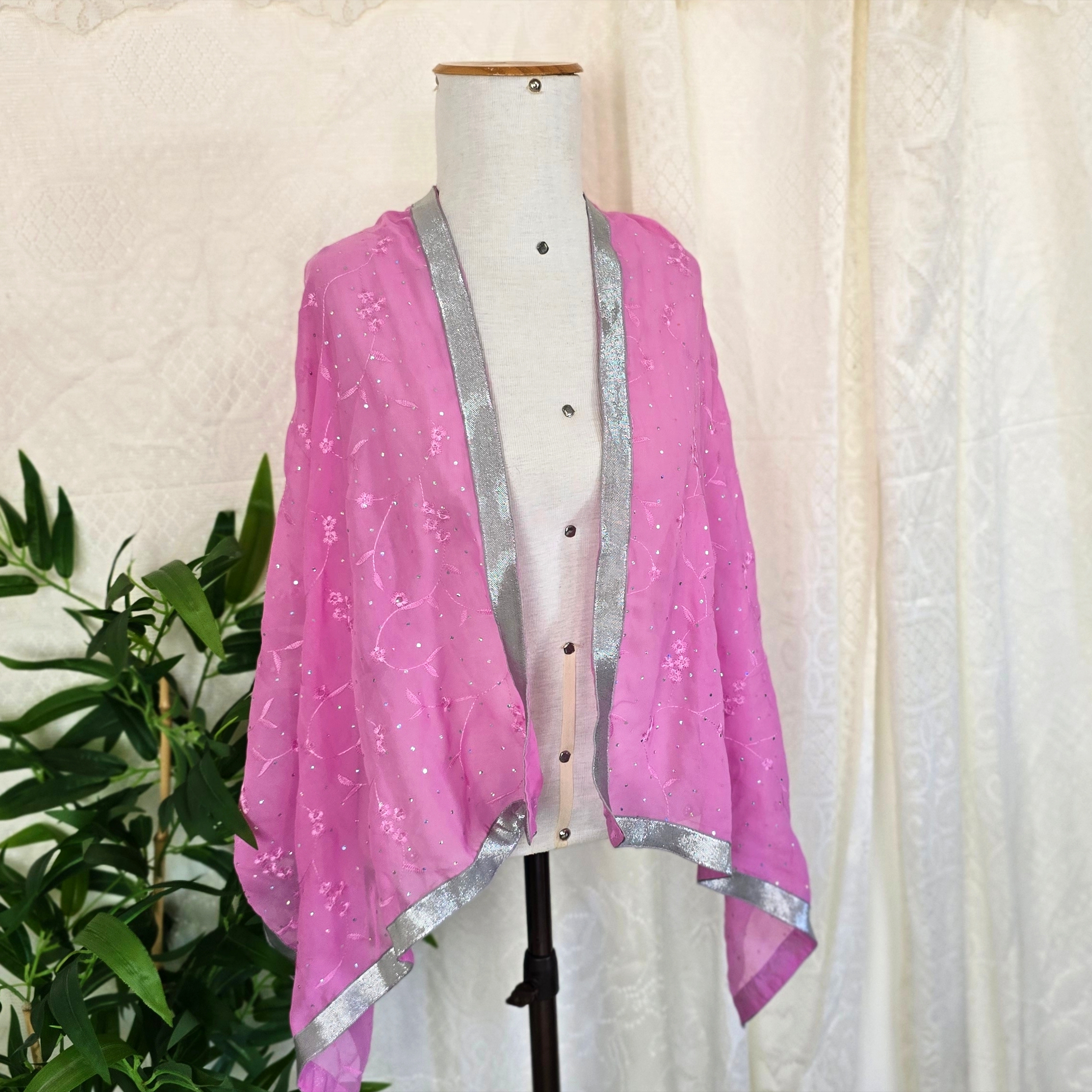 echarpe / xale rosa com bordado floral e detalhes prateados.