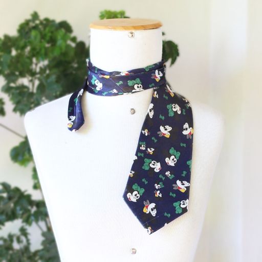 Gravata importada, 100% poliéster, azul escuro com estampa Mickey e Minnie. Possui alguns fios puxados. Ponta mais larga com 10,5cm.