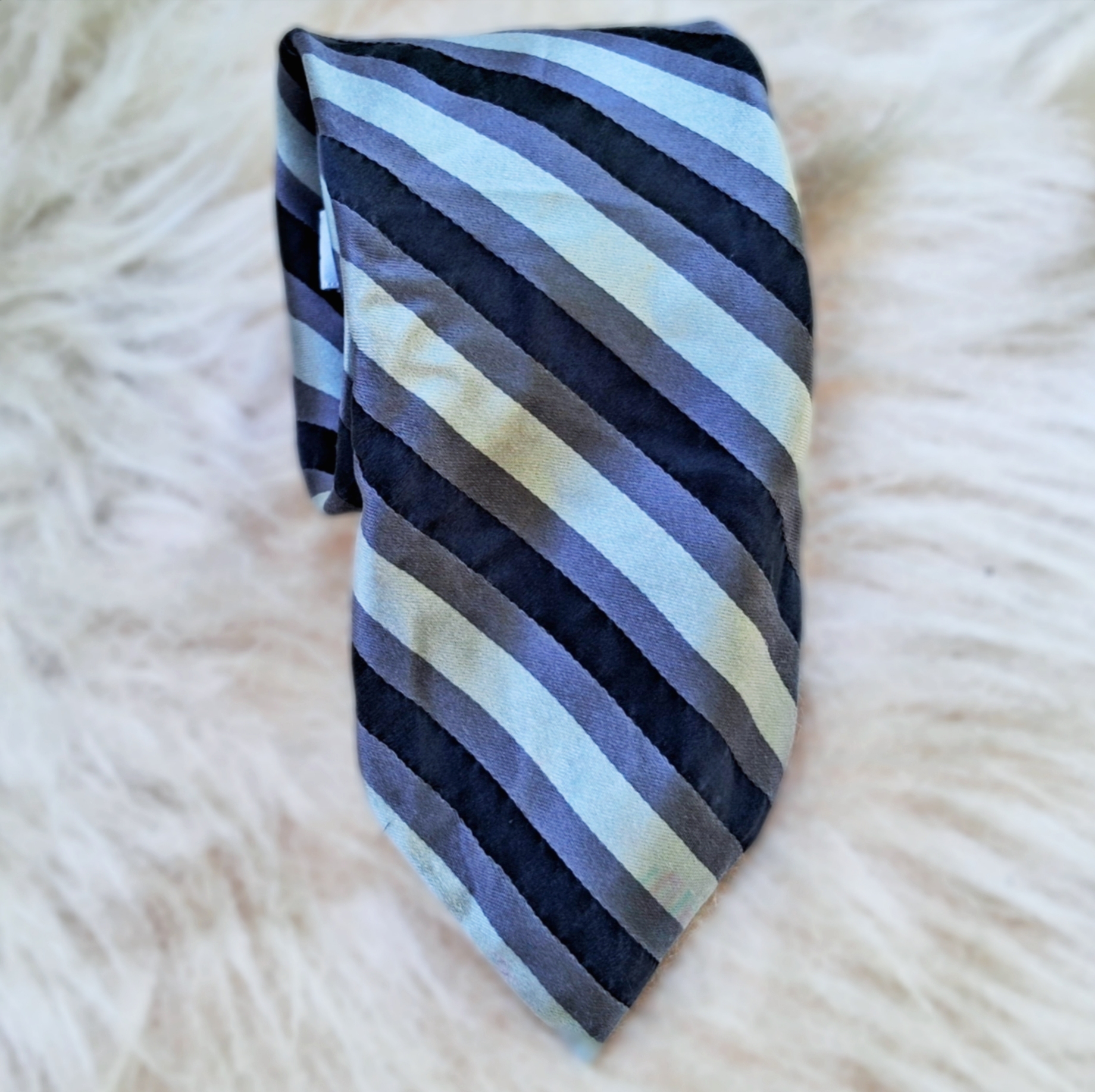 Gravata Pierre Cardin, de seda em tons de cinza listrada levemente metalizada. 8,5cm largura