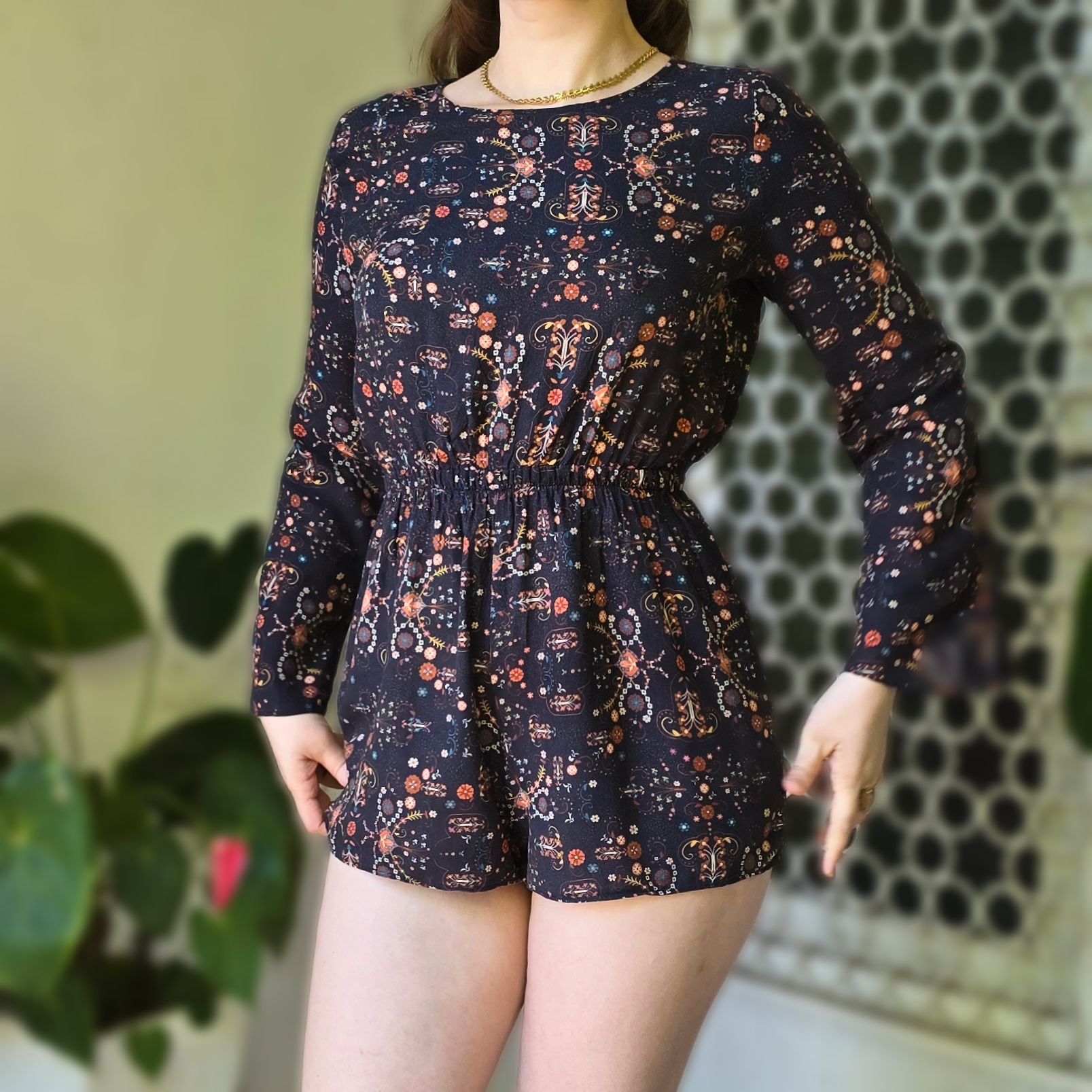 Macaquinho preto floral de viscose, modelo curto com manga longa, cintura marcada com elástico e decote nas costas abotoado.