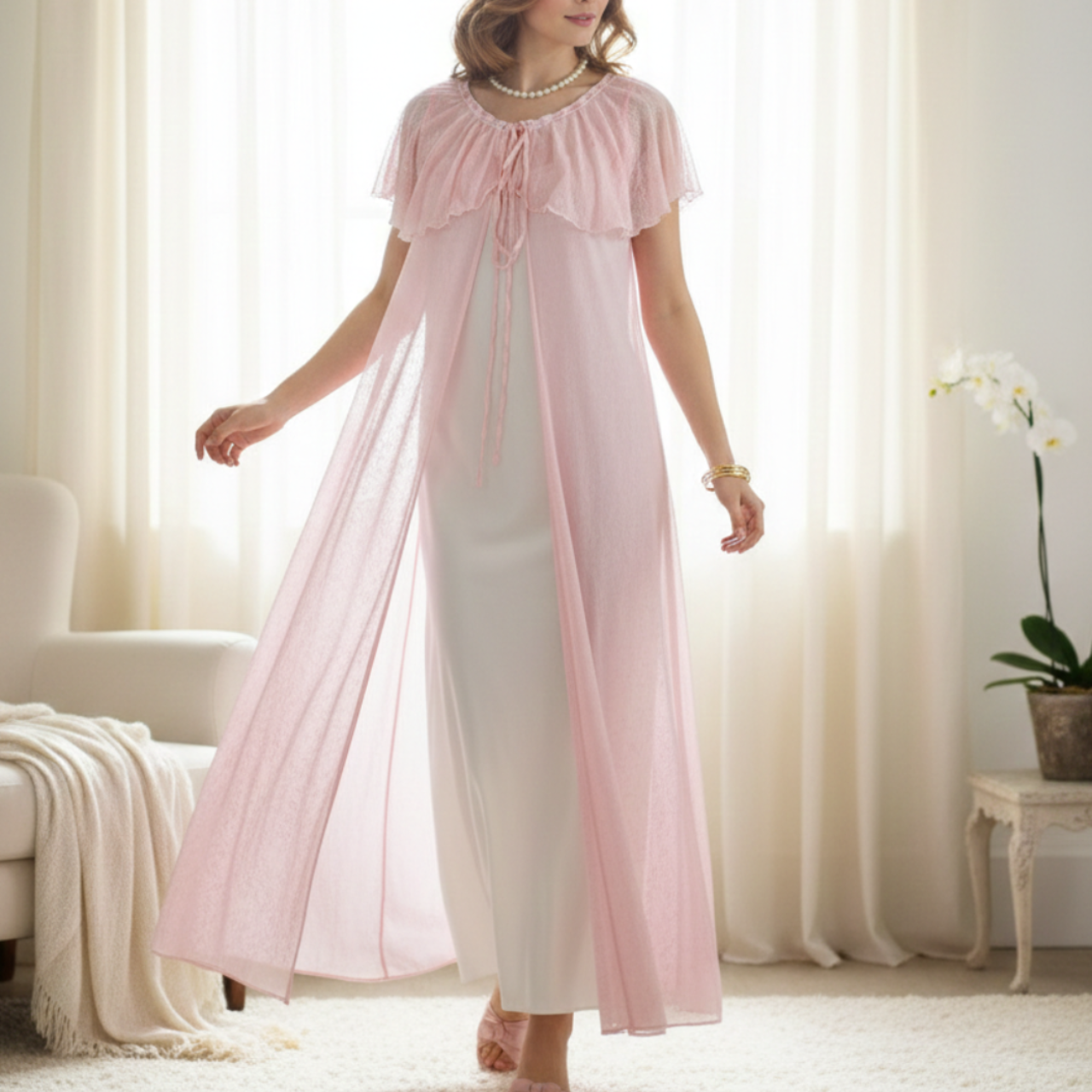 penhoar longo vintage, com cgc, rosa perolado de poliamida. possui babados rendados e laço para amarrar.