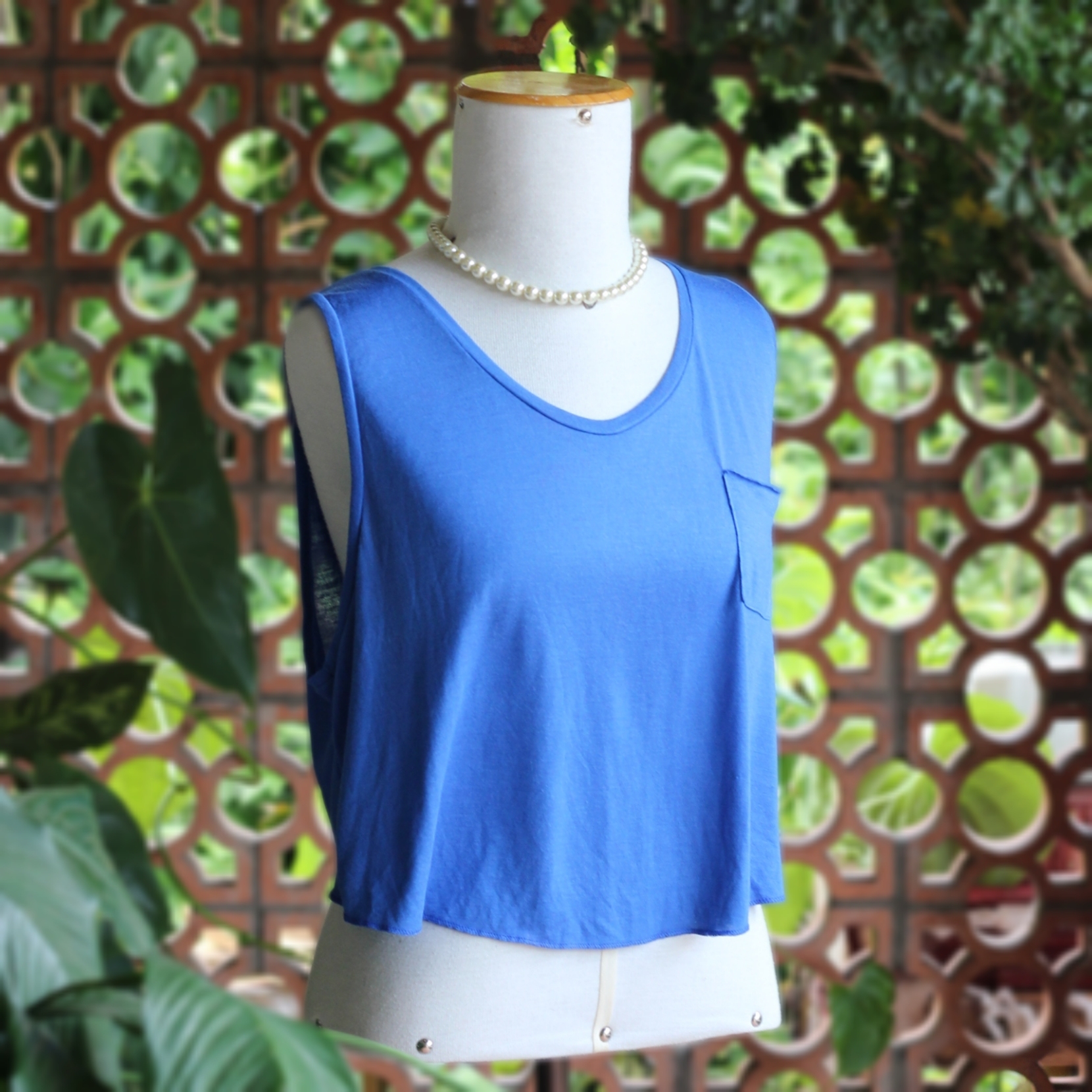 Regata cropped azul de algodão. Possui a parte frontal levemente maior. Com bolso frontal funcional.
