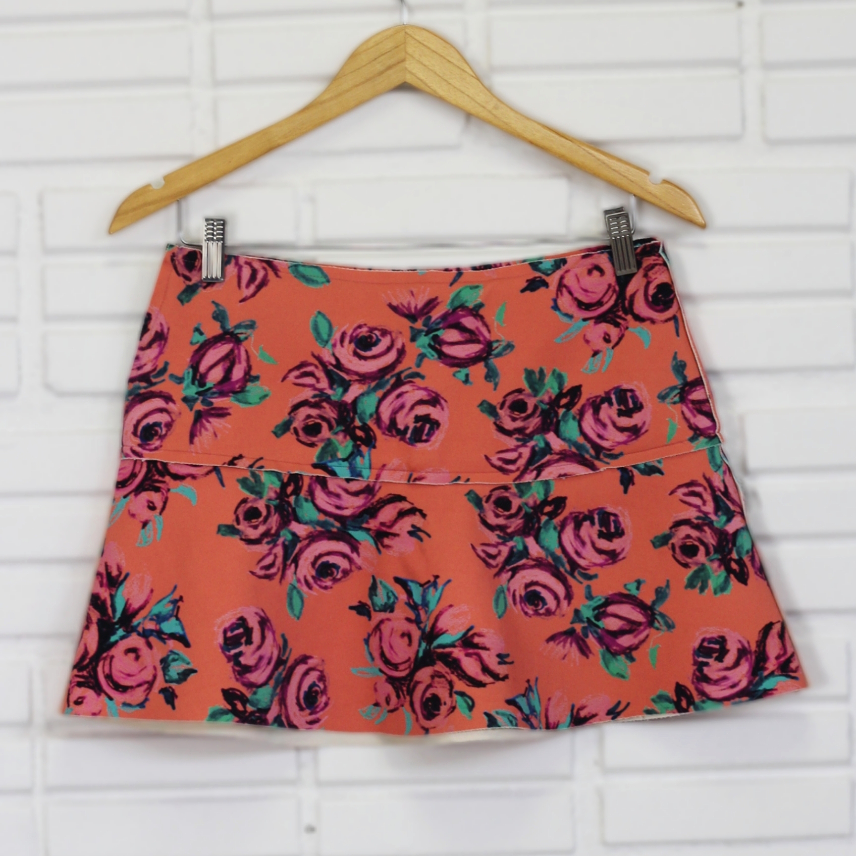 Minissaia rodada rosa salmão de neoprene com estampa floral. Possui zíper lateral.
