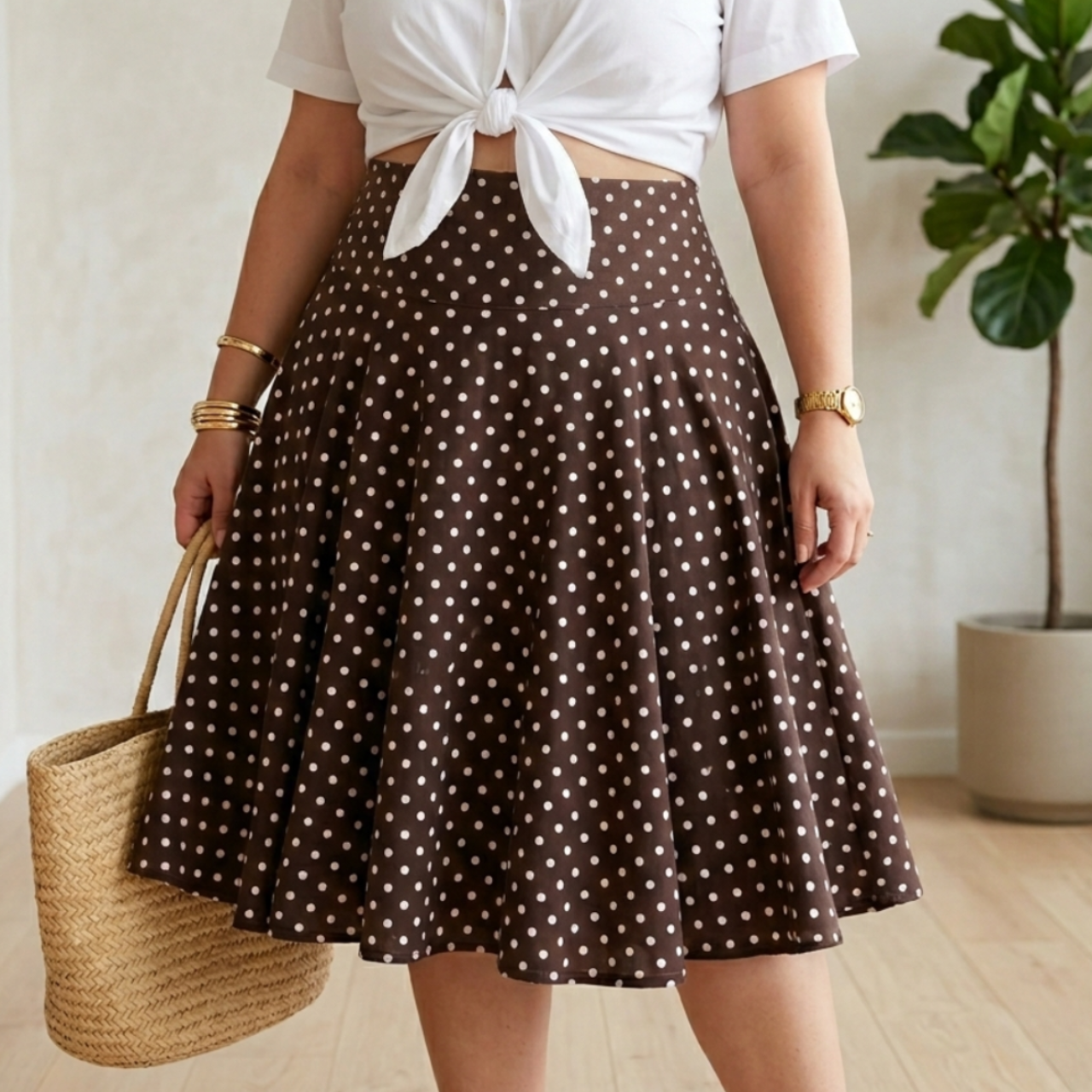 Saia de algodão marrom com poá branco, modelo godê com cintura alta e zíper invisível traseiro. Feita por modista.