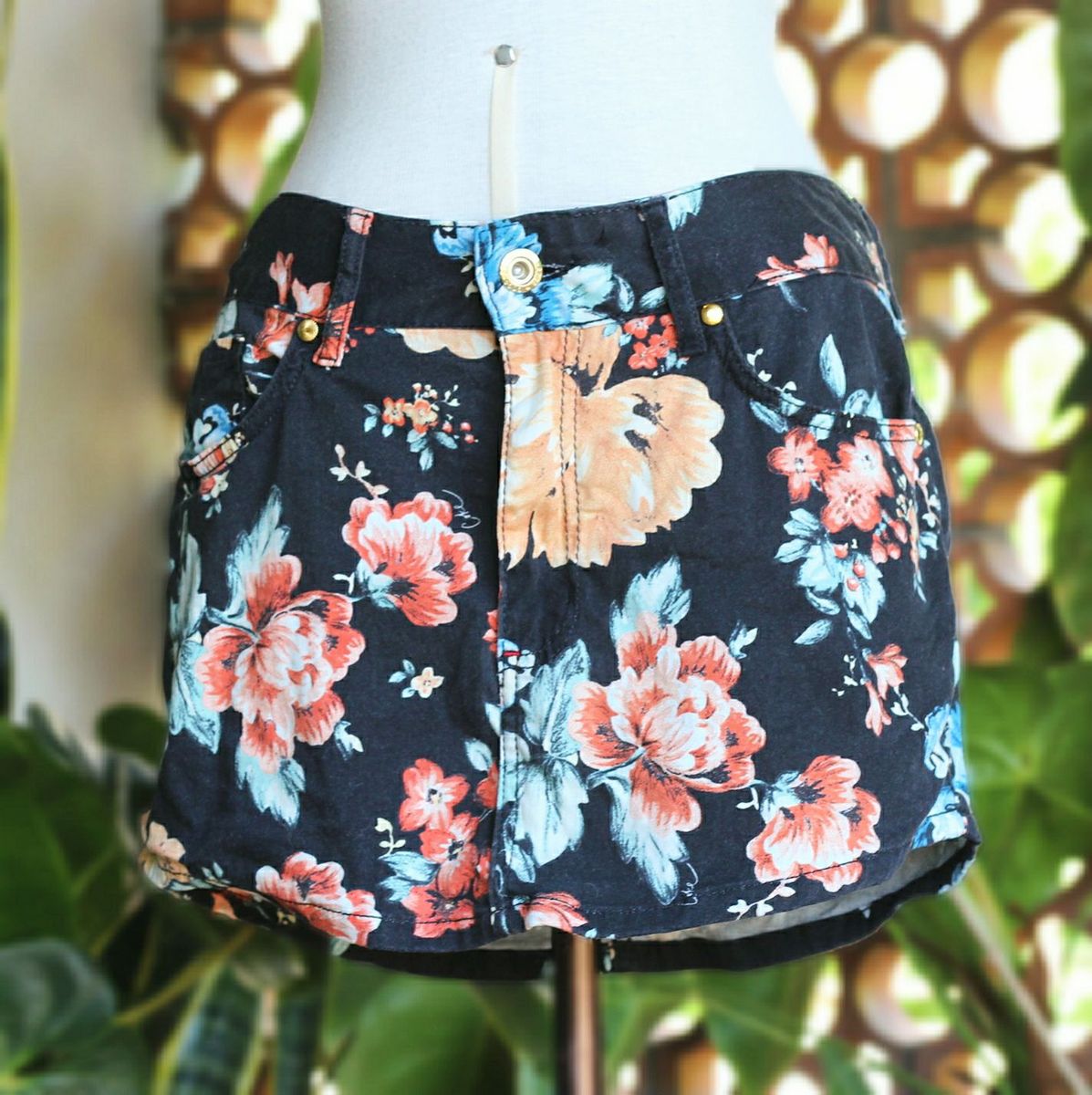 saia jeans preta com estampa floral (algodão com 2% de elastano), possui bolsos funcionais e passantes para cinto.