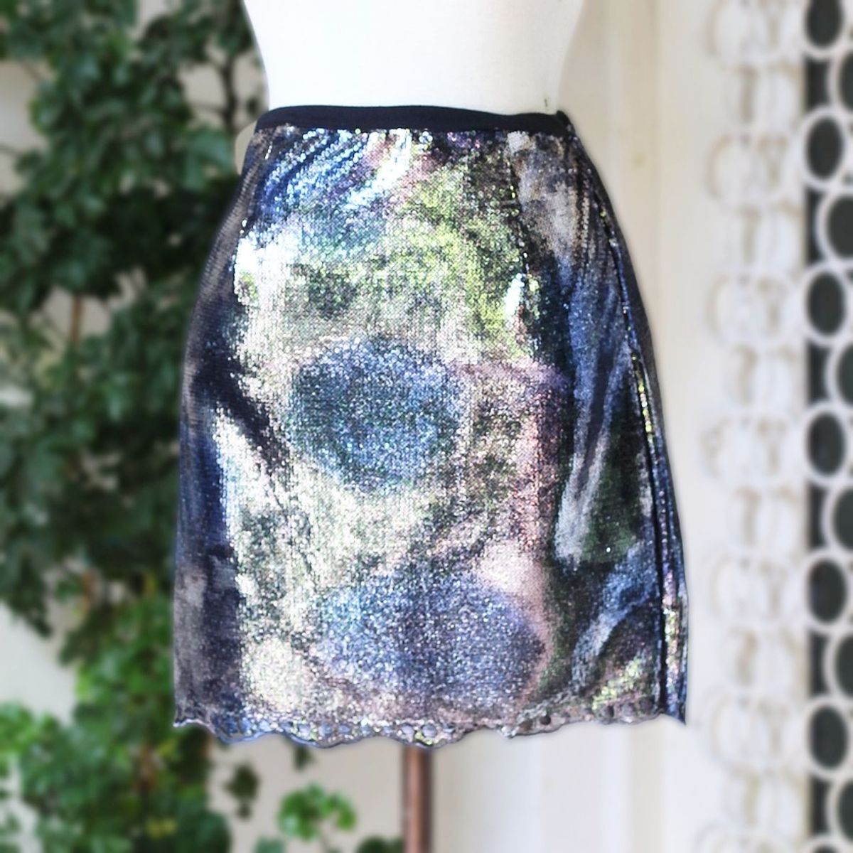 minissaia de malha preta com aplicação de paetês metalizados estilo holográfico. com forro e zíper lateral.