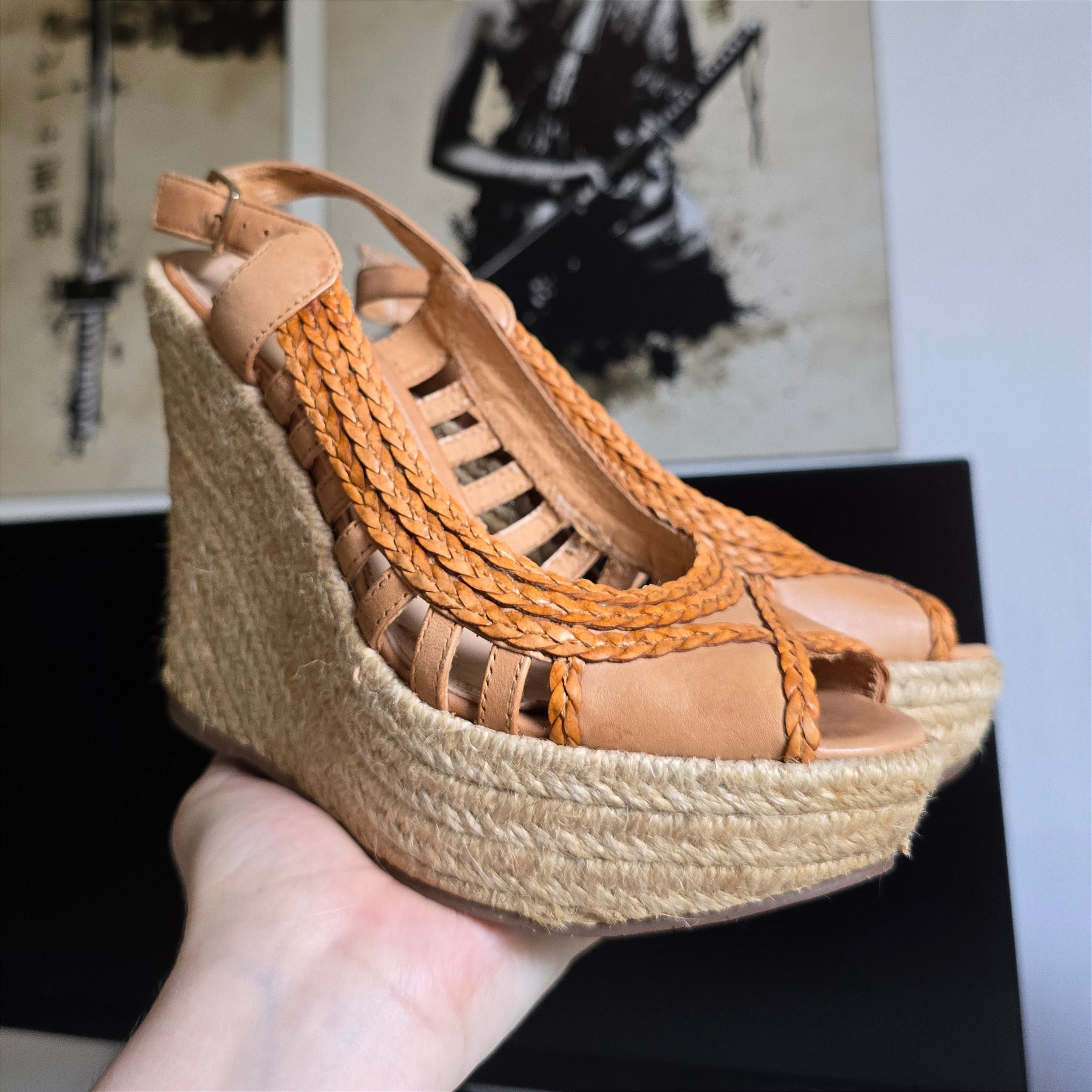 sandália plataforma arezzo, tamanho 34, na cor marrom. feita em couro com detalhes de trançado. possui salto de 12cm e solado de corda sisal. apresenta leve desgaste na sola e palmilha, conforme fotos.
