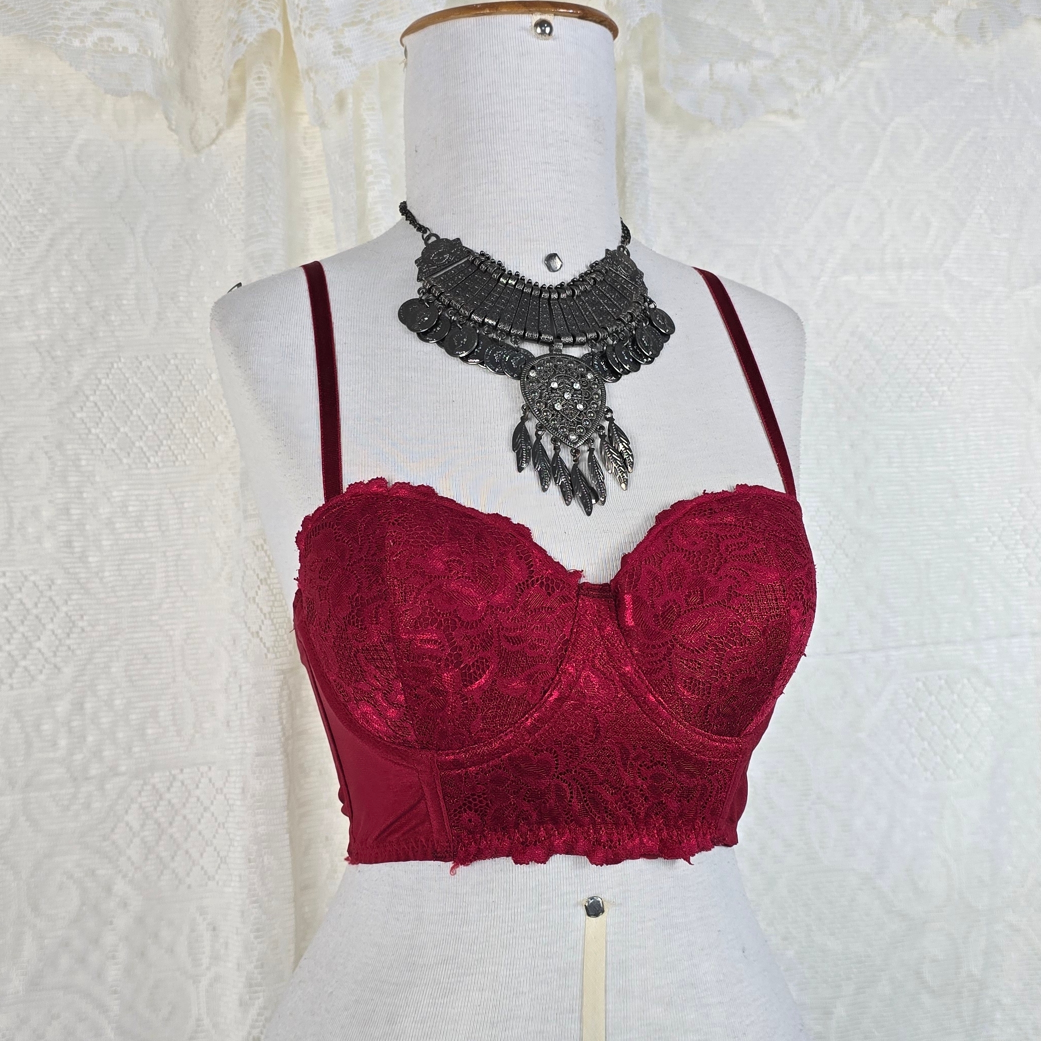 Sutiã vermelho rendado com bojo estruturado e barbatanas laterais. Possui três opções de ajuste.