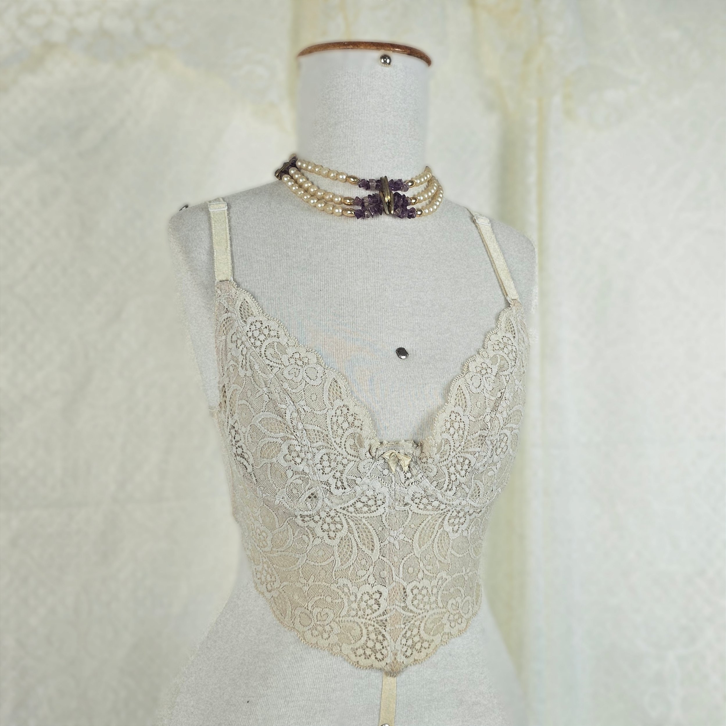 Sutiã estruturado estilo corpete Triumph Carina Vintage (CGC). Renda floral off-white de alta sustentação, com aro e sem bojo. Possui barbatanas. Peça rara dos anos 90.