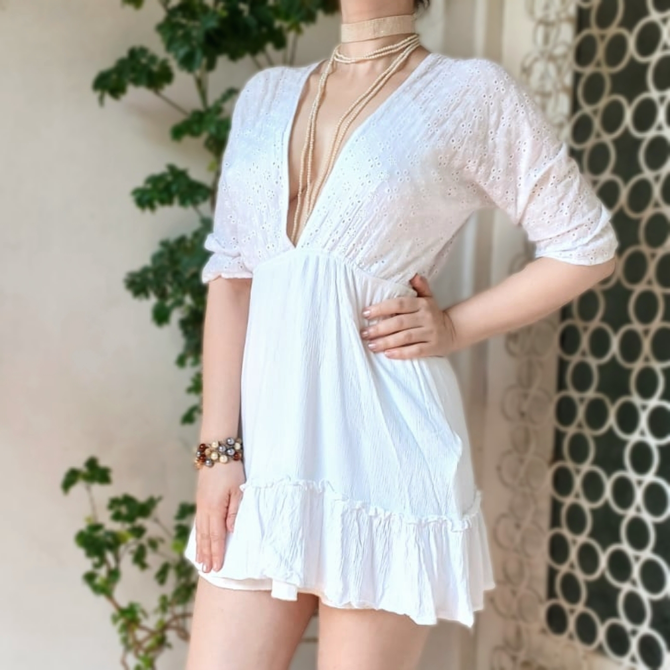 Vestido curto, branco em laise de algodão com viscose, possui decote pronunciado, mangas 3/4, amarração nas costas, forro e elástico na cintura e nas mangas. Boby Blues / Veste M / Condição 9/10 90-95cm busto, 70-74cm cintura, até 110cm quadril e 77cm comprimento. praia reveillon verão