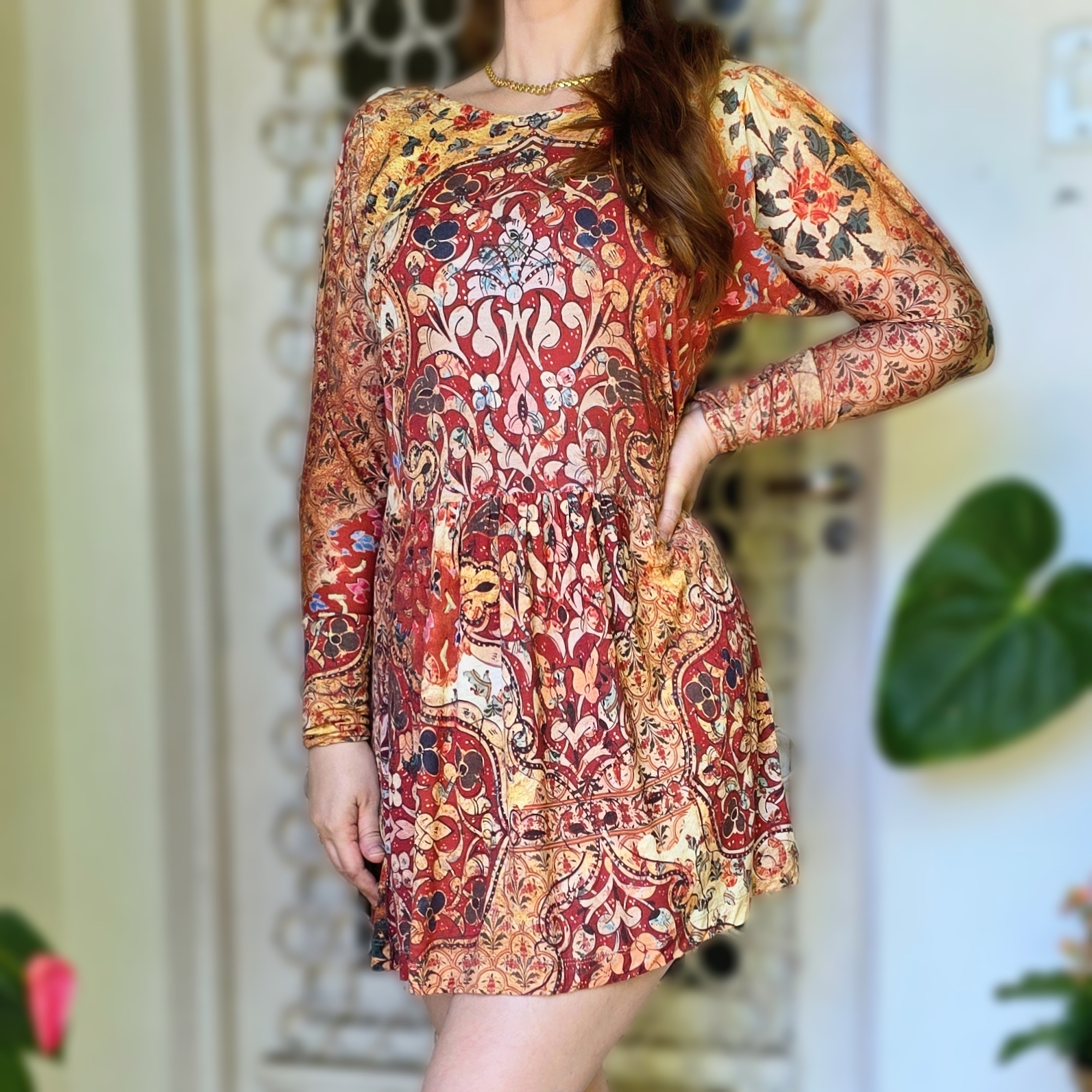 Vestido marrom floral de tecido leve e macio (parece ser algodão + elastano), modelo com saia rodada e manga longa.