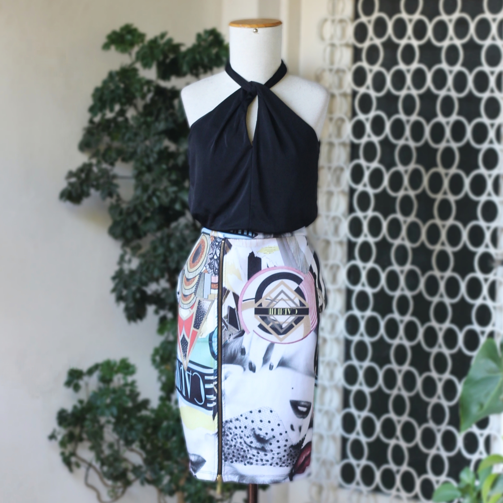 vestido tubinho de malha preta com forro e parte inferior de neoprene branco estampado. modelo midi, com decote em gota na frente e costas, fechamento com botões e zíper frontal.