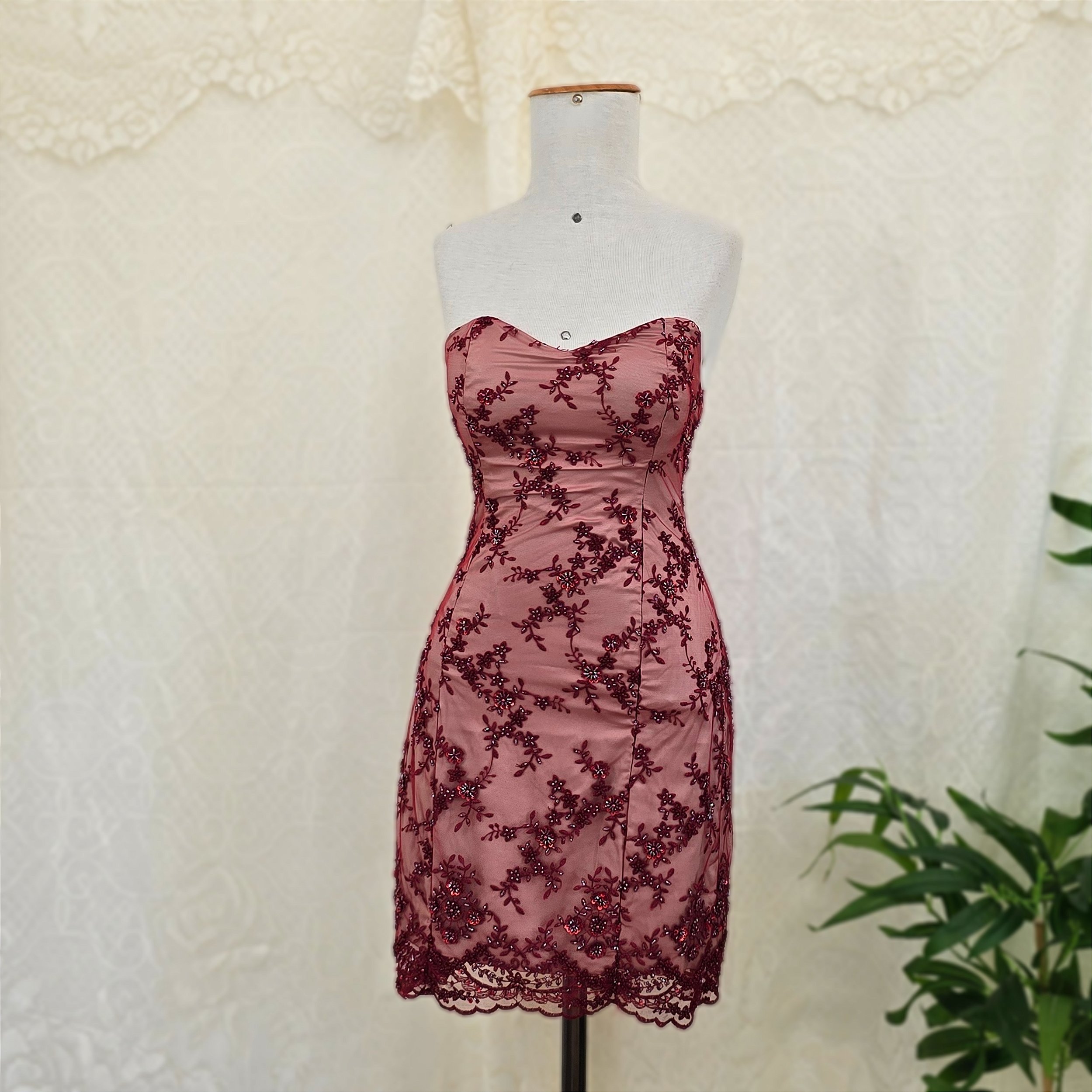 Vestido tubinho de festa cor bordô, de tule bordado com aplicação de pedrarias. Possui bojo, forro e zíper invisível.