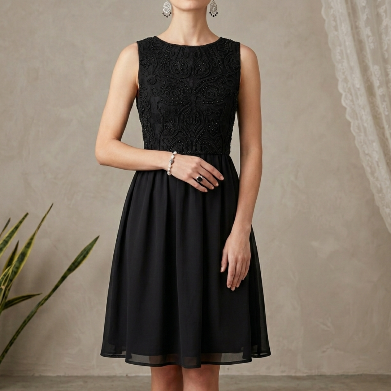 Vestido festa preto de tecido sintético (parte superior com elasticidade e de baixo plana). Modelo com aplicação de renda e miçangas, saia rodada e cintura marcada, forro e zíper invisível nas costas.