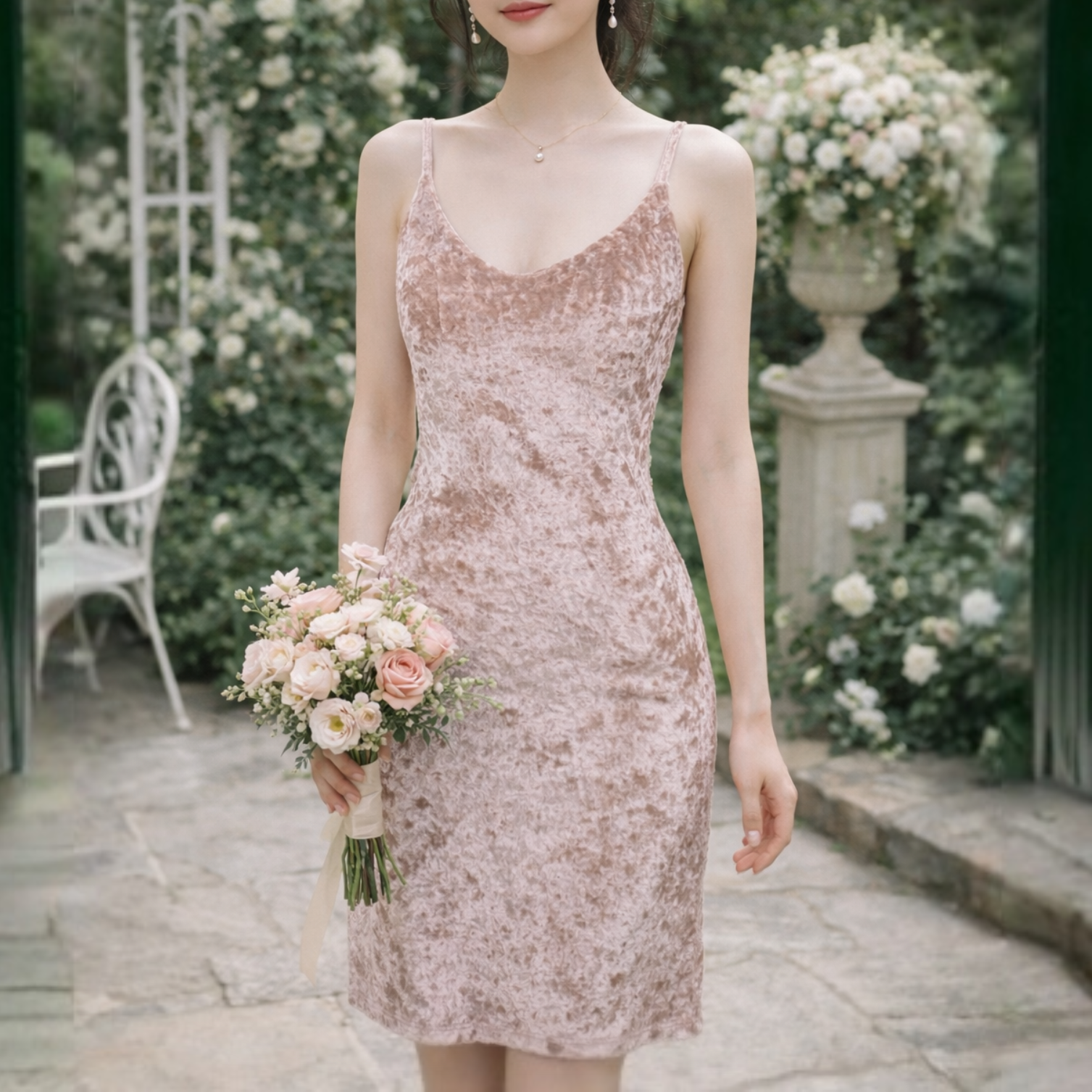 Vestido tubinho vintage rosa salmão de veludo molhado (poliéster com elastano). Modelo com alças finas e bojo.